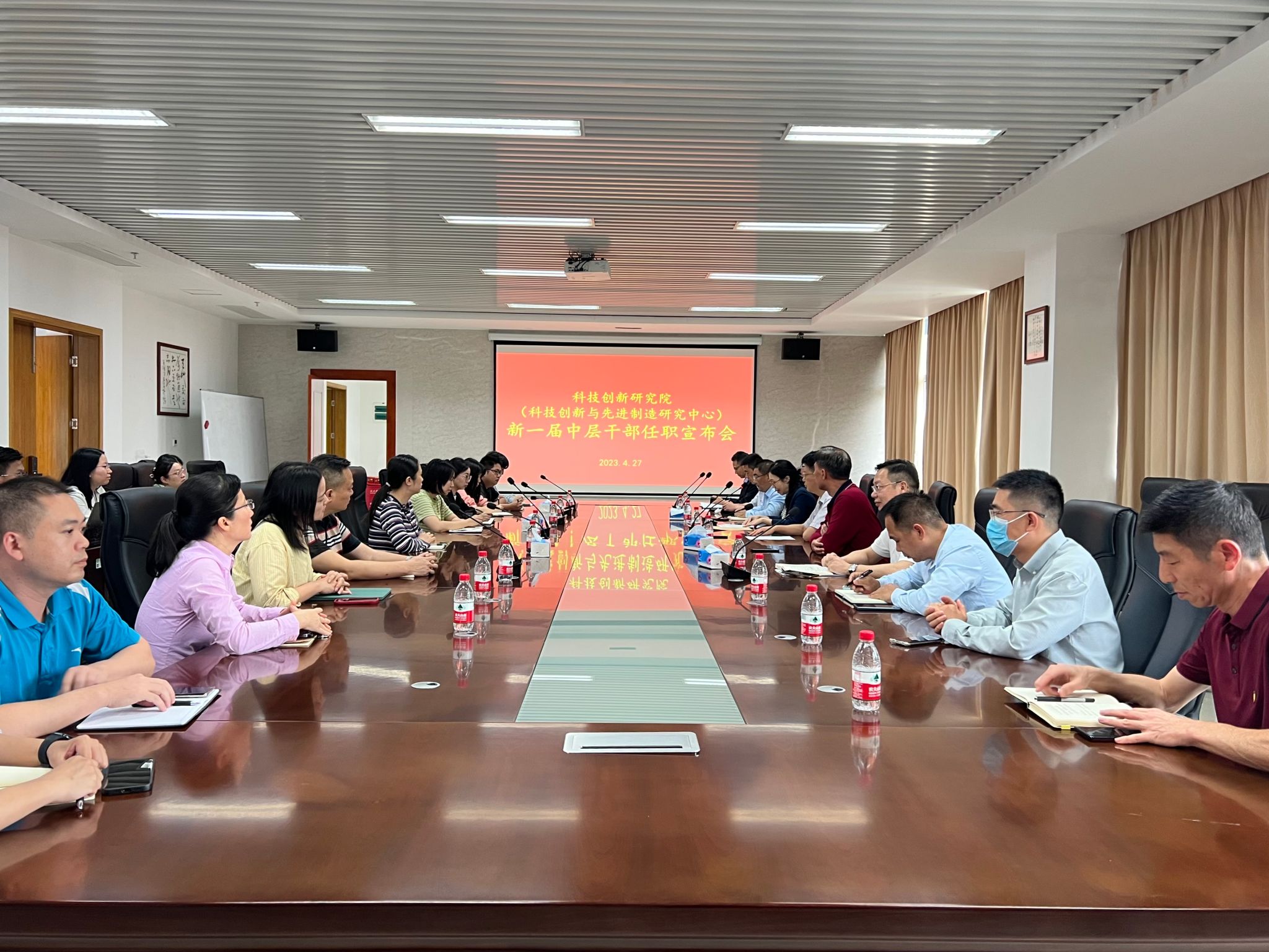 黄睿科长宣读了学校新一届中层干部任命决定,任命夏能礼同志为科技创新研究院(科技创新与先进制造研究中心)院长(主任),魏亚东、刘翔两名同志为科技创新研究院(科技创新与先进制造研究中心)副院长(副主任),黄兢同志为科技创新研究院(科技创新与先进制造研究中心)党总支书记(副主任)。