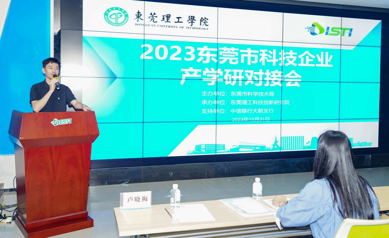 2023年10月31日下午,由东莞市科学技术局主办,华体会tiyu 承办,东莞理工学院科技资源大数据研究与成果转化中心协办、中信银行东莞大朗支行支持的“2023科技企业政产学研金对接会”活动,在我院顺利举行。