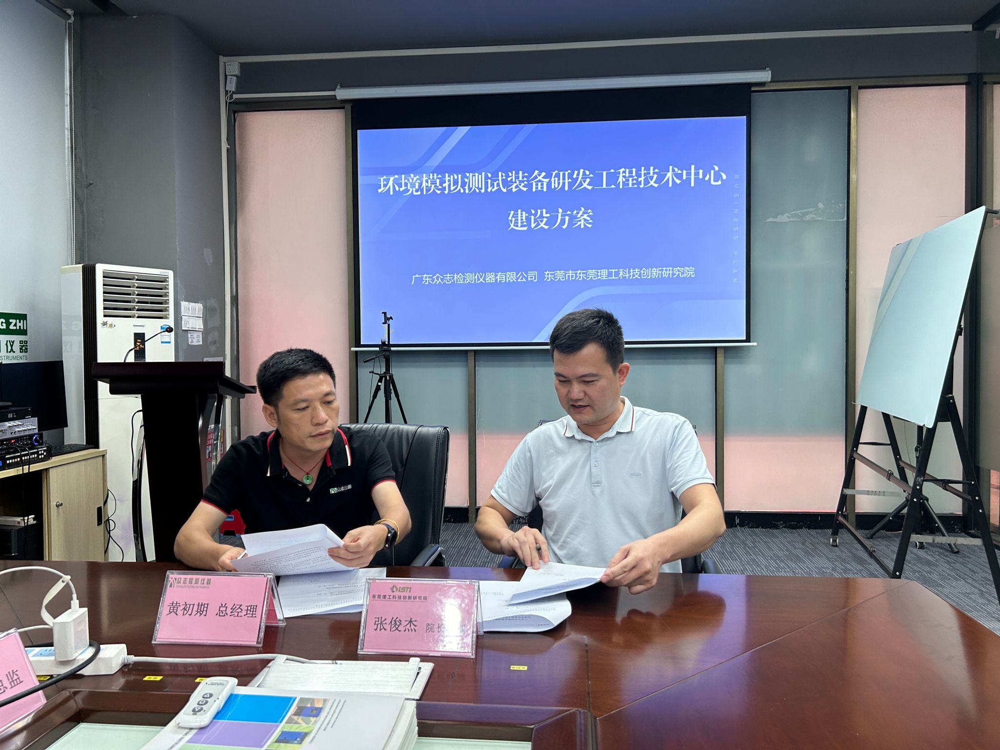 (以下简称“研究院”)与广东众志检测仪器有限公司(以下简称“众志检测公司”)为共同建设“环境模拟测试装备研发工程技术中心”及“产学研合作基地”,在东莞市沙田镇举行战略合作协议签署仪式。此次合作标志着双方在环境模拟测试装备研发领域迈出了坚实的一步,将共同推动该领域的技术创新与发展。