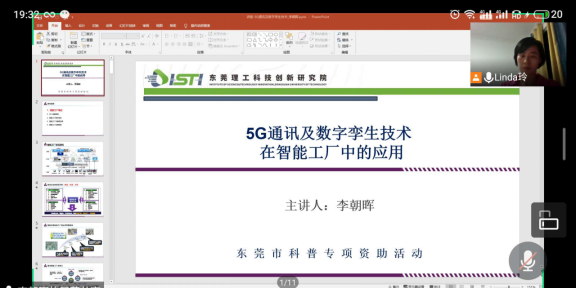 2020年10月20号晚,在东莞市科学技术协会、东莞理工学院的支持与指导下,我院通过腾讯会议举办了“5G通讯及数字孪生技术在智能工厂中的应用”线上讲座。本次讲座,邀请现任广东省智能机器人研究院工业大数据中心李朝晖副主任作为主讲人。李朝辉是武汉创景可视技术有限公司创始人、董事长,智能智能制造资深专家,自主可控工业软件践行者,国内“数字孪生系统”研发与应用推广的发起人之一。