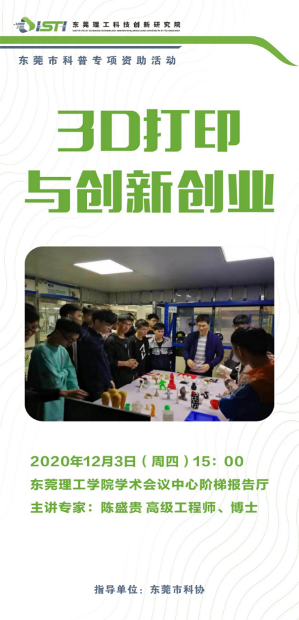 本次讲座将邀请东莞理工学院3D打印与智能制造研究中心陈盛贵高工为大家讲授3D打印在创新创业的应用及概述。欢迎东莞理工学院广大师生亲临科普讲座现场,一起学习和探讨3D打印的工艺技术、发展前景以及在智能制造方面的应用。