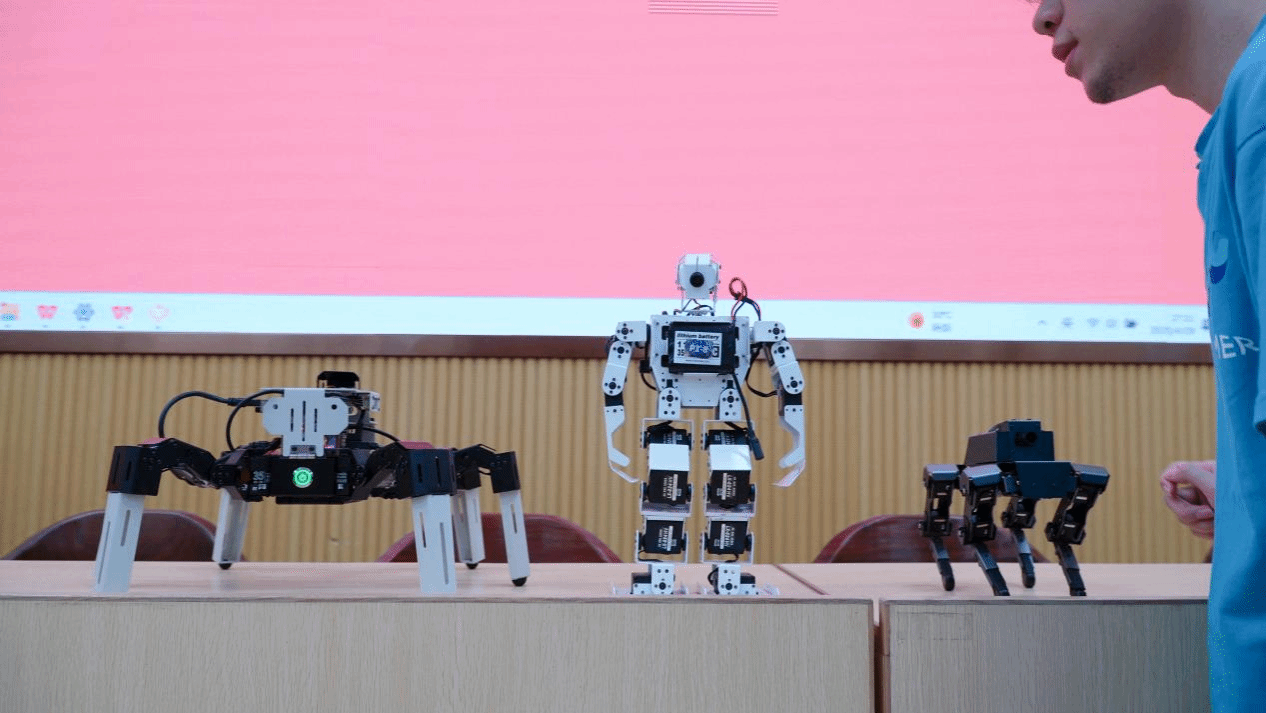 在学生分会场,同学们通过实践操作,体验了人脸识别解锁软件系统、手势控制虚拟画板、提示词生成水墨画作,直观体验了计算机视觉与生成式AI的运行逻辑。在图形化编程环节中,同学们通过拖动封装模块,让人形机器人完成仰卧起坐、指挥六足蜘蛛前进后退、操控机器狗跳踢踏舞。同学们通过现场老师的讲解,从理论学习、编程实践、到实物制作,项目式的完成了基于物联网传感器的智能家居系统。
