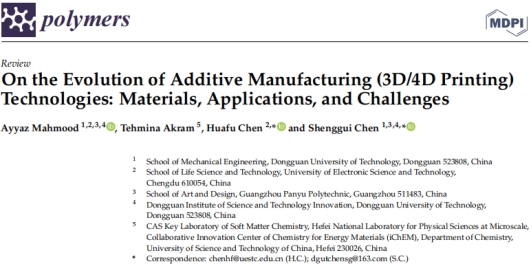 本研究以《On the Evolution of Additive Manufacturing (3D/4D Printing) Technologies: Materials, Applications, and Challenges》为题发表在SCI收录期刊《Polymers》(IF2022=4.967,JCR Q1区)。该论文是增材制造(3D/4D打印)技术的发展研究综述,Ayazz Mahmood博士(东莞理工学院科技创新研究院3D打印与智能制造研究中心科研人员,机械工程学院外籍博士后)为本文第一作者,陈盛贵高级工程师(东莞理工学院科技创新研究院3D打印与智能制造研究中心研究方向负责人)和陈华富教授(电子科技大学生命科学与技术学院教授、博士生导师,国家杰出青年基金获得者)为本文通讯作者。