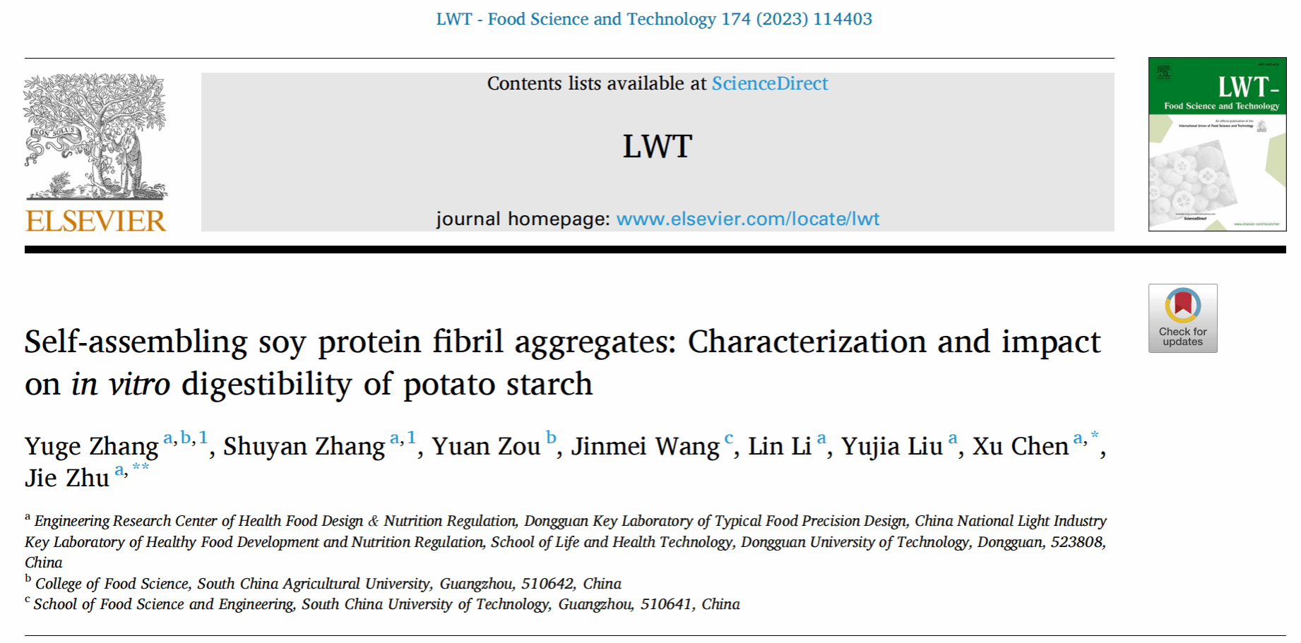 本研究以《Self-assembling soy protein fibril aggregates: Characterization and impact onin vitrodigestibility of potato starch》为题发表在SCI收录期刊《LWT-FOOD SCIENCE AND TECHNOLOGY》(IF: 6.056, Q1)。东莞理工学院-华南农业大学联合培养在读硕士张昱格为本文第一作者,东莞理工学院食品营养健康工程与智能化加工研究中心张书艳硕士为共同一作,陈旭博士和朱杰副教授为通讯作者。该论文是我校生命健康技术学院与联合高校共同培养硕士研究生积累的又一新成果。