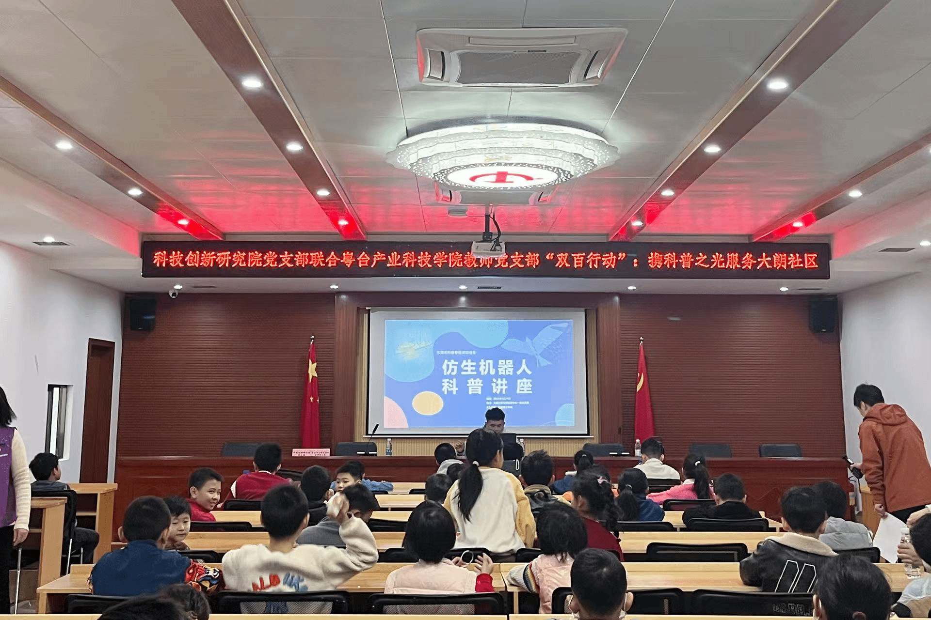 为进一步推进校地深度合作,全面落实“双百行动”结对共建工作要求,2025年1月16日下午,科技创新研究院党支部赴大朗社区举办“仿生机器人科普讲座”,携科普之光为社区教育注入新活力,推动教育帮扶工作走深走实,活动吸引了40多名社区青少年参加。